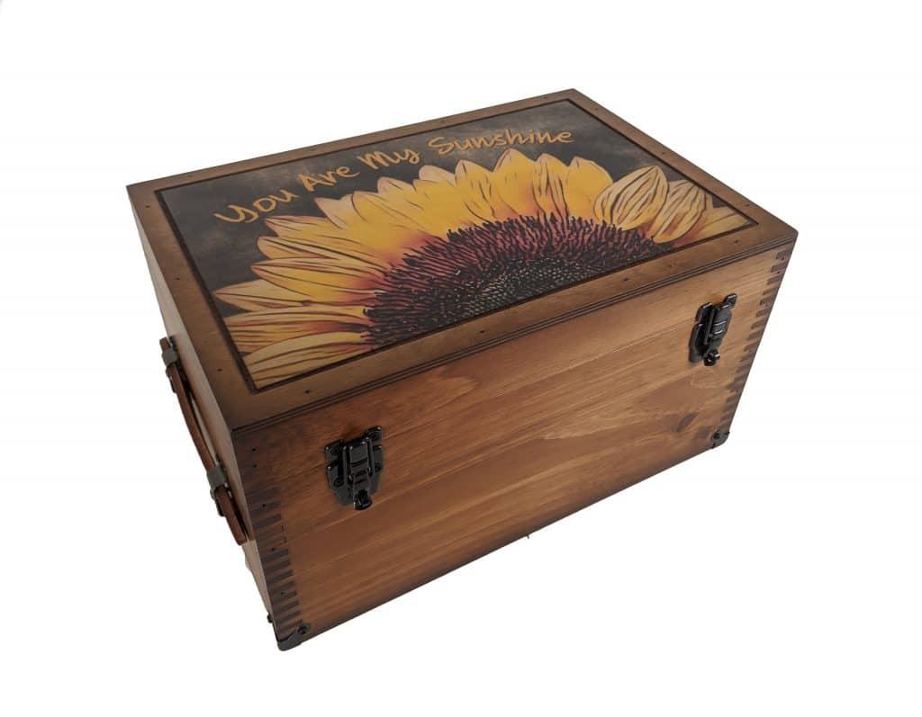 New design! The You Are My Sunshine Keepsake box is the perfect gift for your special someone. Whether it be Valentine’s Day, Mother’s Day, an anniversary, or even a birthday. Your loved one will be blown away by our handcrafted in USA wooden accents. This decorative wooden keepsake box will provide a unique conversation piece in their home or office and make a great place to keep special mementos. Additionally, you can customize this You Are My Sunshine Keepsake box with black felt on the inside lid, an engraved brass nameplate up to 75 characters, and a 5×5 brass plaque.